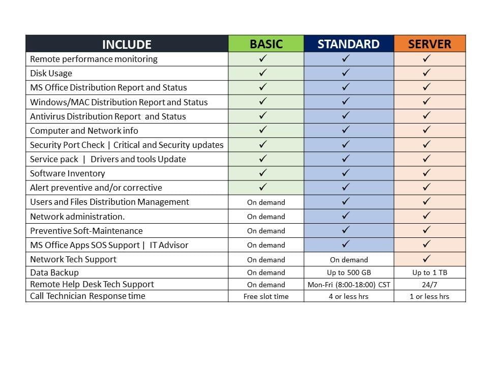 Help Desk, Monitoring, Cybersecurity, Maintenance, Connectivity issues, Data Back up, and Purchase of Upgrade or New Equipment.